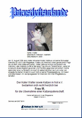 Walter hat eine Patin gefunden Geschlecht: männlich/kastriert Am 10. August 2009 kam Walter mit seiner Mutter Waltraud und seiner Schwester Mienchen zu uns in die Pflegestelle. Walter und Mienchen waren gerade erst 6 Tage alt und litten unter Katzenschnupfen. Walter hatte es nicht so doll erwischt wie Mienchen, aber trotzdem durfte er fast jeden Tag mit zum Tierarzt fahren.Leider ist er dadruch etwas ängstlich geworden und Fremden gegenüber schüchtern. Nichts desto trozt hat er nur Blödsinn im Kopf. Er klettert Gardinen rauf und runter, der eingezäunte Garten hindert ihn auch nicht an seiner Freizeitgestaltung. Wir haben uns entschlossen