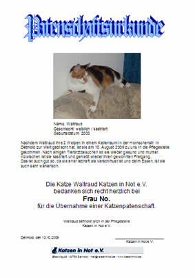 Waltraud hat eine Patin gefunden Geschlecht: weiblich/kastriert Nachdem Waltraud ihre 2 Welpen in einem Kellerraum in der Hornschenstr. in Detmold zur Welt gebracht hat, ist sie am 10. August 2009 zu uns in die Pflegestelle gekommen. Nach einigen Tierarztbesuchen ist sie wieder gesund und munter. Inzwischen ist sie kastriert und genießt wieder ihren gewohnten Freigang.